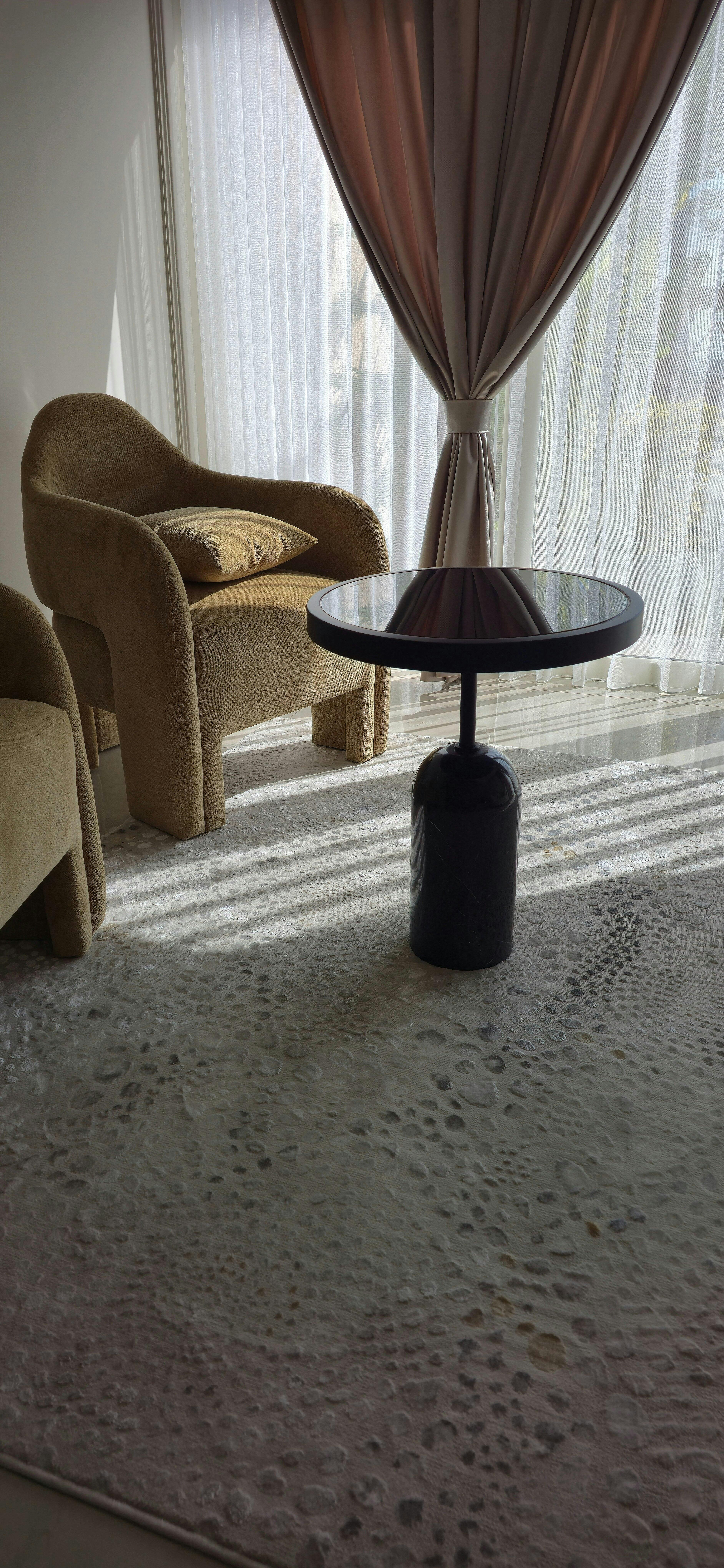• Description: Is an exquisite side table that embodies sophistication and style. Crafted from stunning Black Spanish marble, depending on your preference, this elegant piece features a sleek round metal surface, finished with a durable electrostatic matte coating that promises to withstand the test of time.