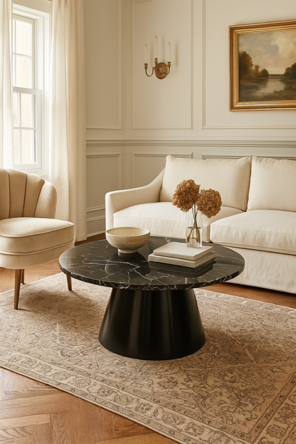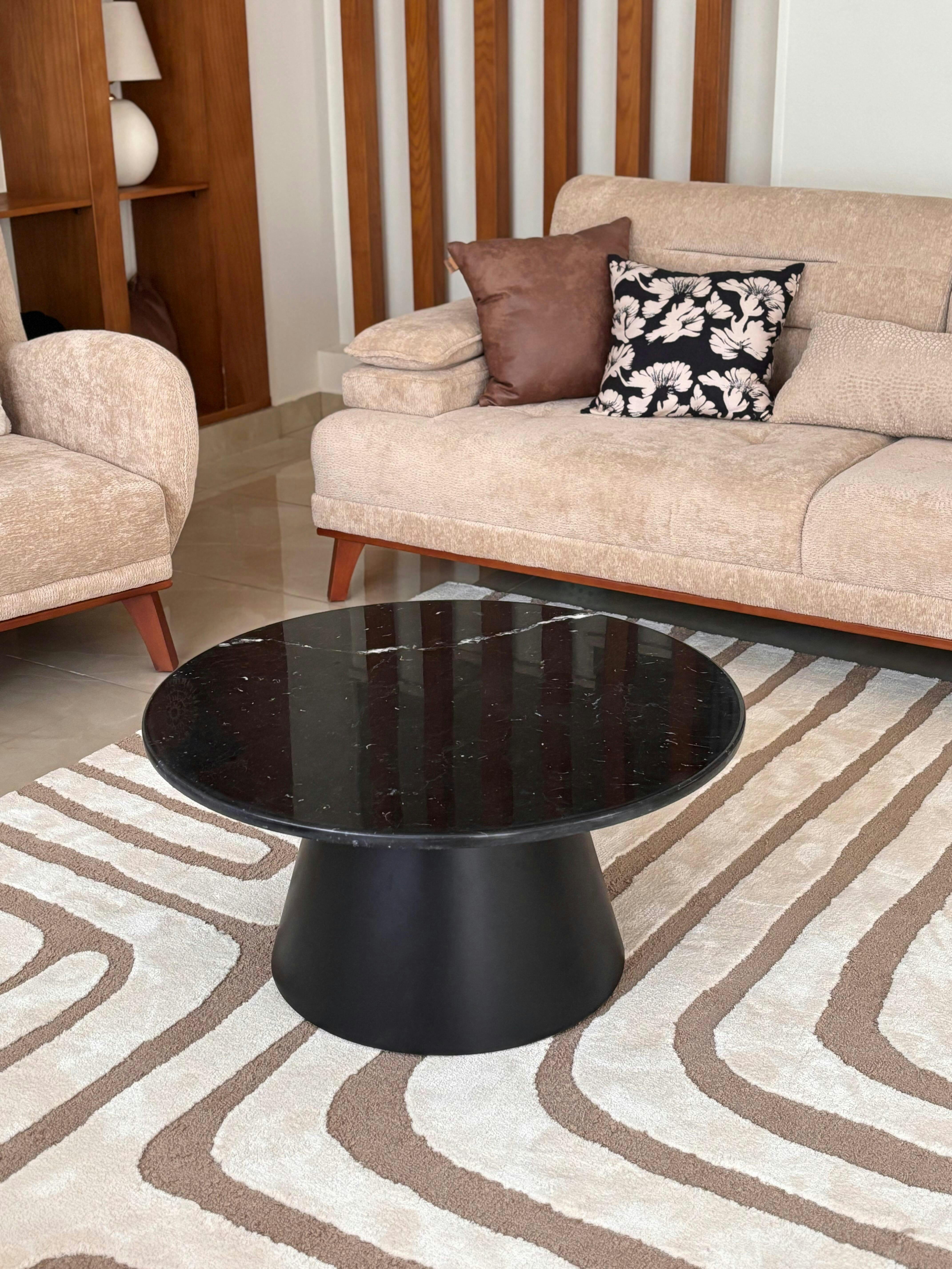 • Description: This is a must-have coffee table that embodies elegance and modern design. Featuring a breathtaking round top crafted from exquisite Black Spanish marble, this table showcases striking white hues and delicate veining, bringing a touch of luxury to any space.
