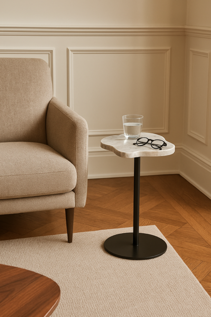 • Description: This is a stunning side table that brings the elegance of nature indoors. Featuring a beautifully crafted floral-shaped top made from luxurious Choco-Indian marble, this table showcases rich, earthy tones and intricate veining, making each piece truly unique. Supported by a robust steel base, finished with durable electrostatic matte paint, Marble Groove offers both stability and style.